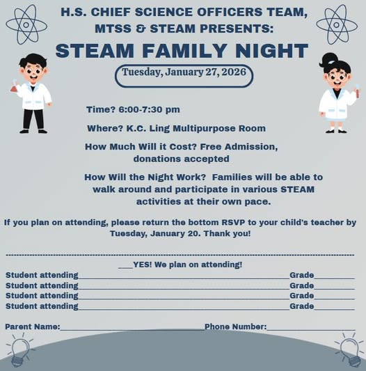 Your student should have brought home a flyer with all the event details. If your family plans to attend, please complete the flyer and return it to your student’s teacher by January 20th.
