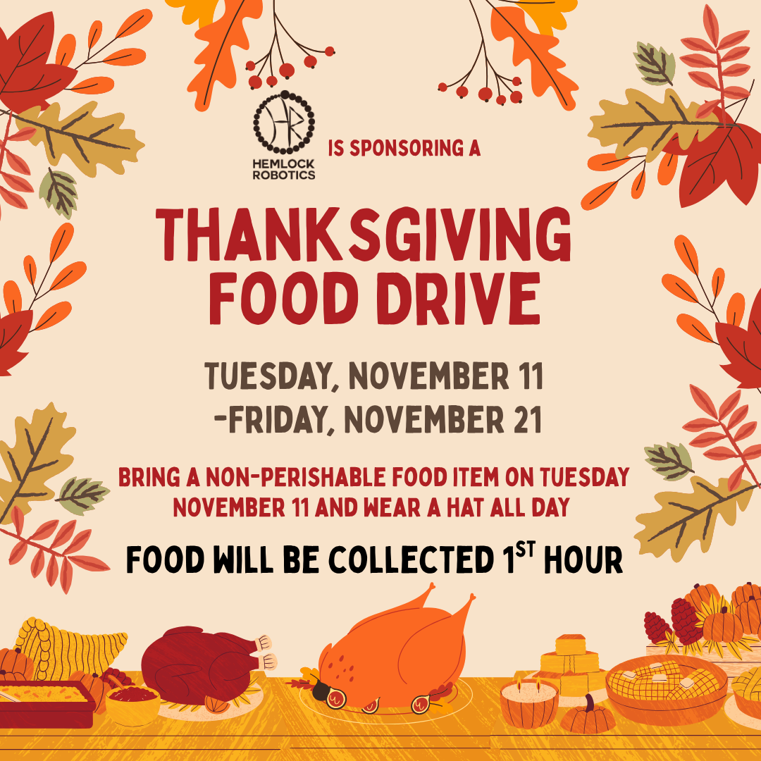 11/21 - Ends 1st Hr. Food Drive Sponsored by Hemlock Robotics
