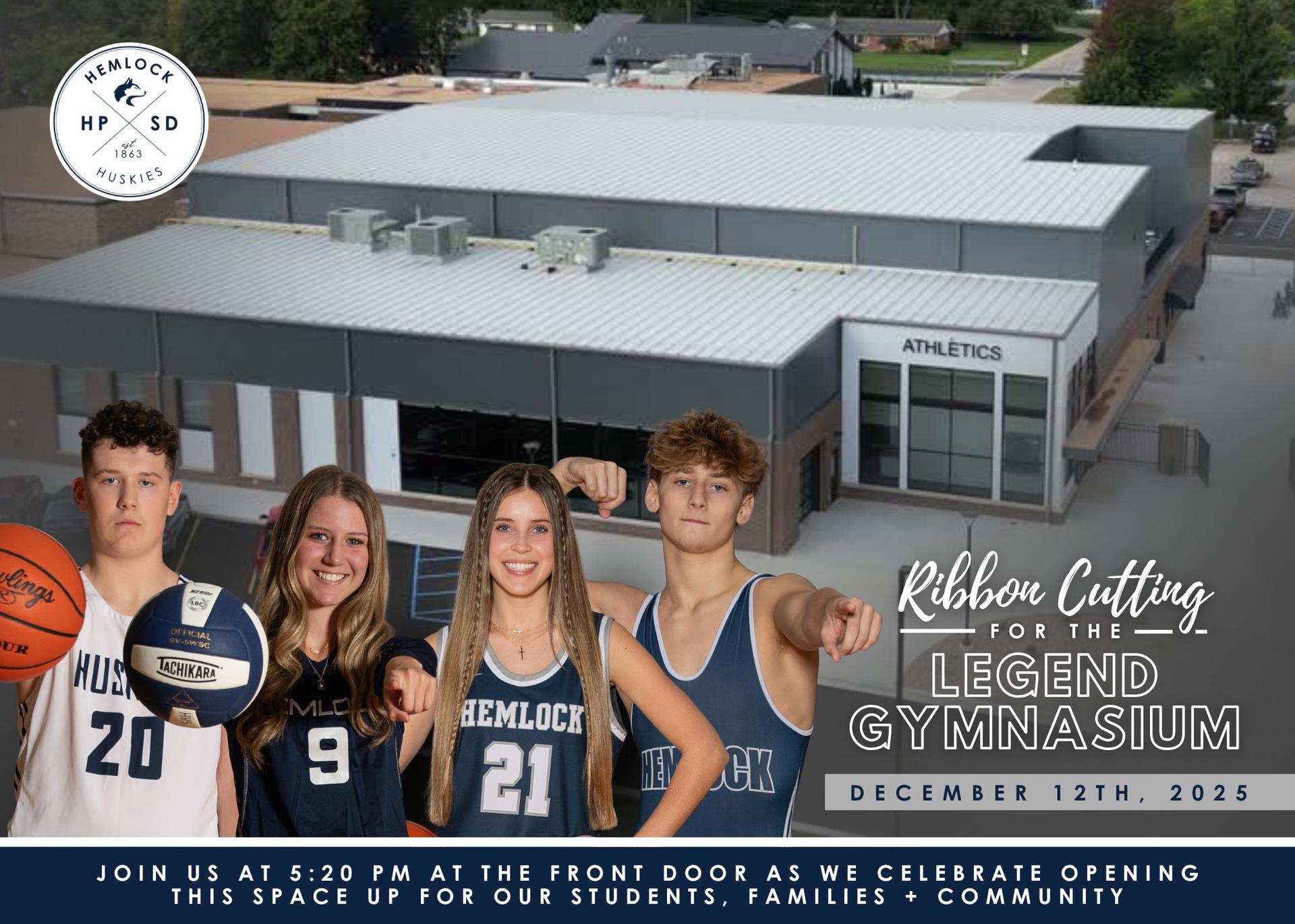 You’re invited to help us celebrate the next big milestone at Hemlock! Join us on Friday, December 12th at 5:20 PM at the front doors of the Legend Gymnasium as we cut the ribbon and officially open this space to our students, families, and community. We can’t wait to share this moment with you! |