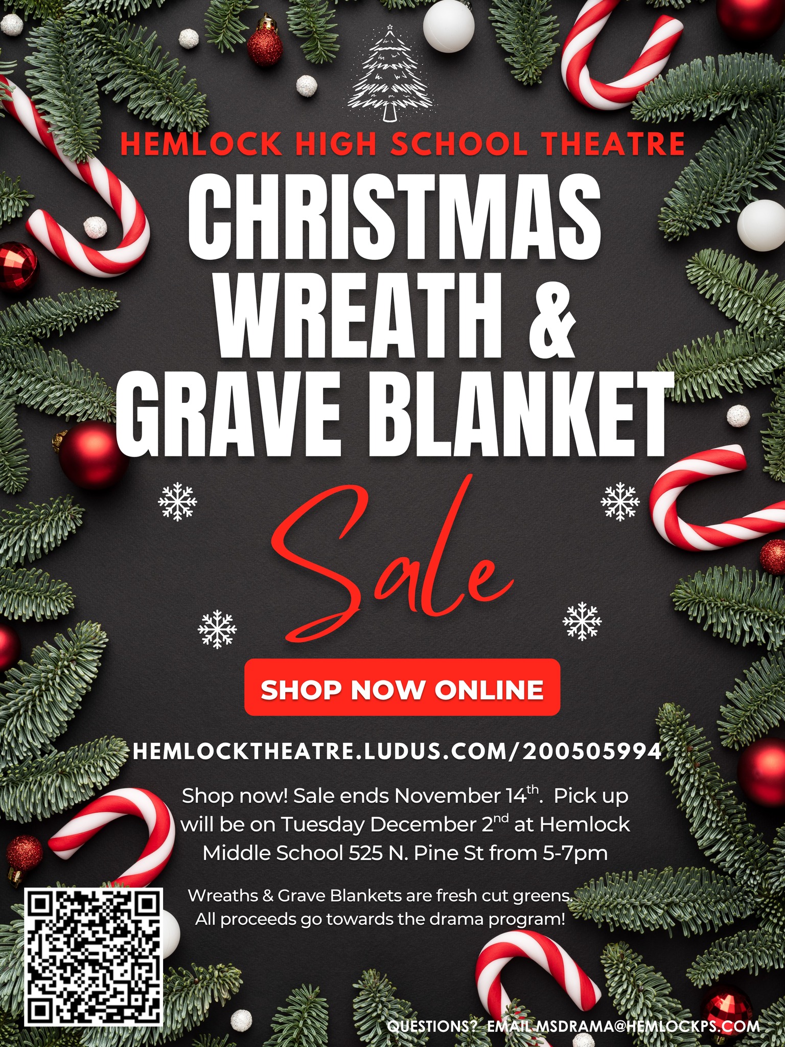 Hemlock High School Theatre is having a Wreath & Grave Blanket fundraiser to raise funds for future shows here at Hemlock! All wreaths and grave blankets are fresh cut greens with your choice of a bow color. You can order online now at hemlocktheatre.ludus.com/200505994 until November 14th. Pick up will be at the Black Box Theatre at Hemlock Middle School (525 N Pine St) on Tuesday December 2nd from 5-7pm. All proceeds go towards HHS drama to help fund future shows!