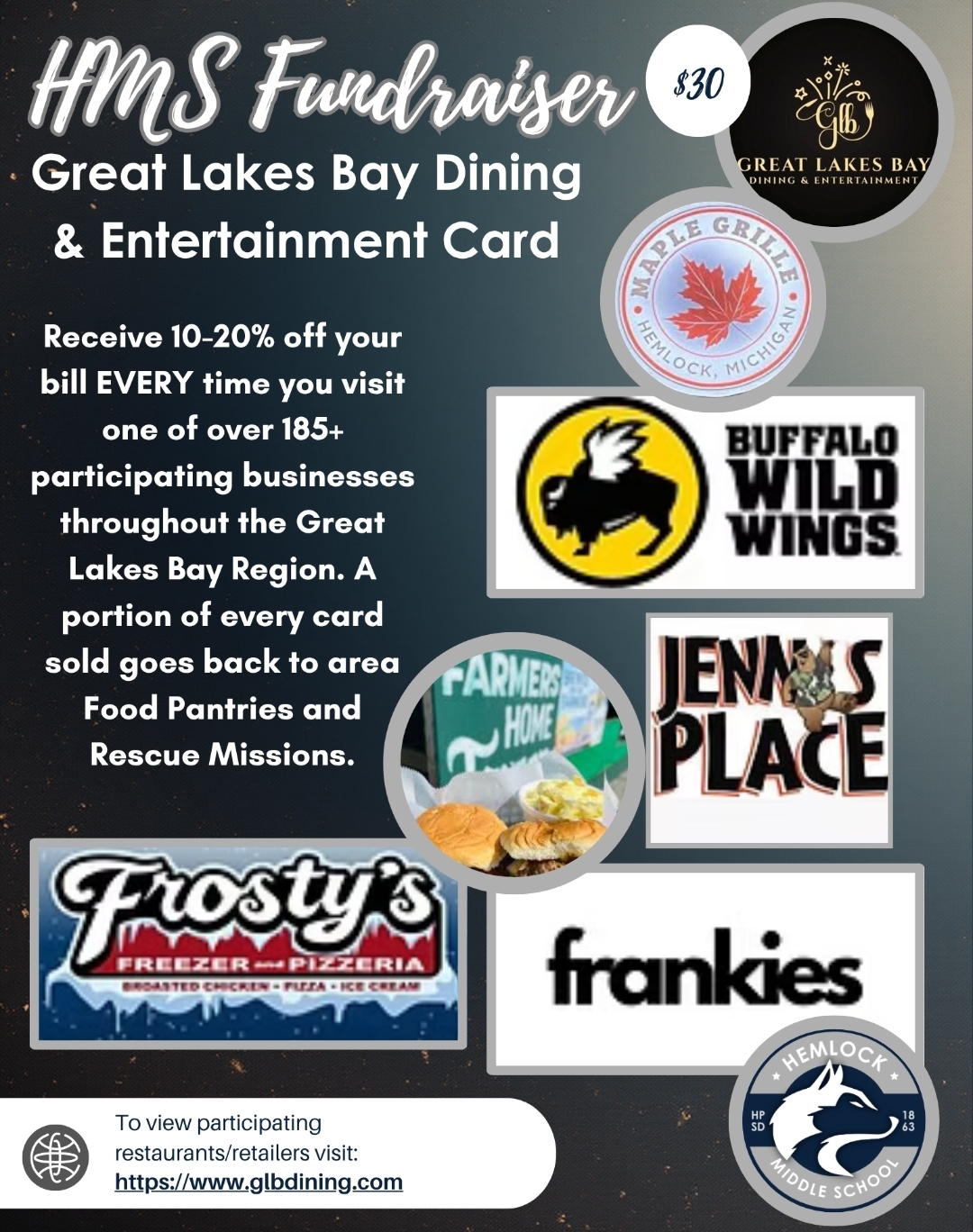Support our Huskies by purchasing a Great Lakes Bay Dining & Entertainment Card! Each card is just $30 and packed with great local discounts and deals. Cards are available for purchase in the office at Hemlock Middle School. Payments can be made by cash or check (payable to Hemlock Public Schools). |