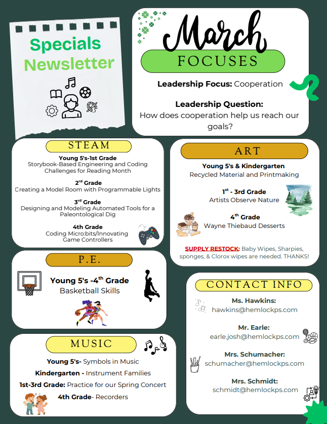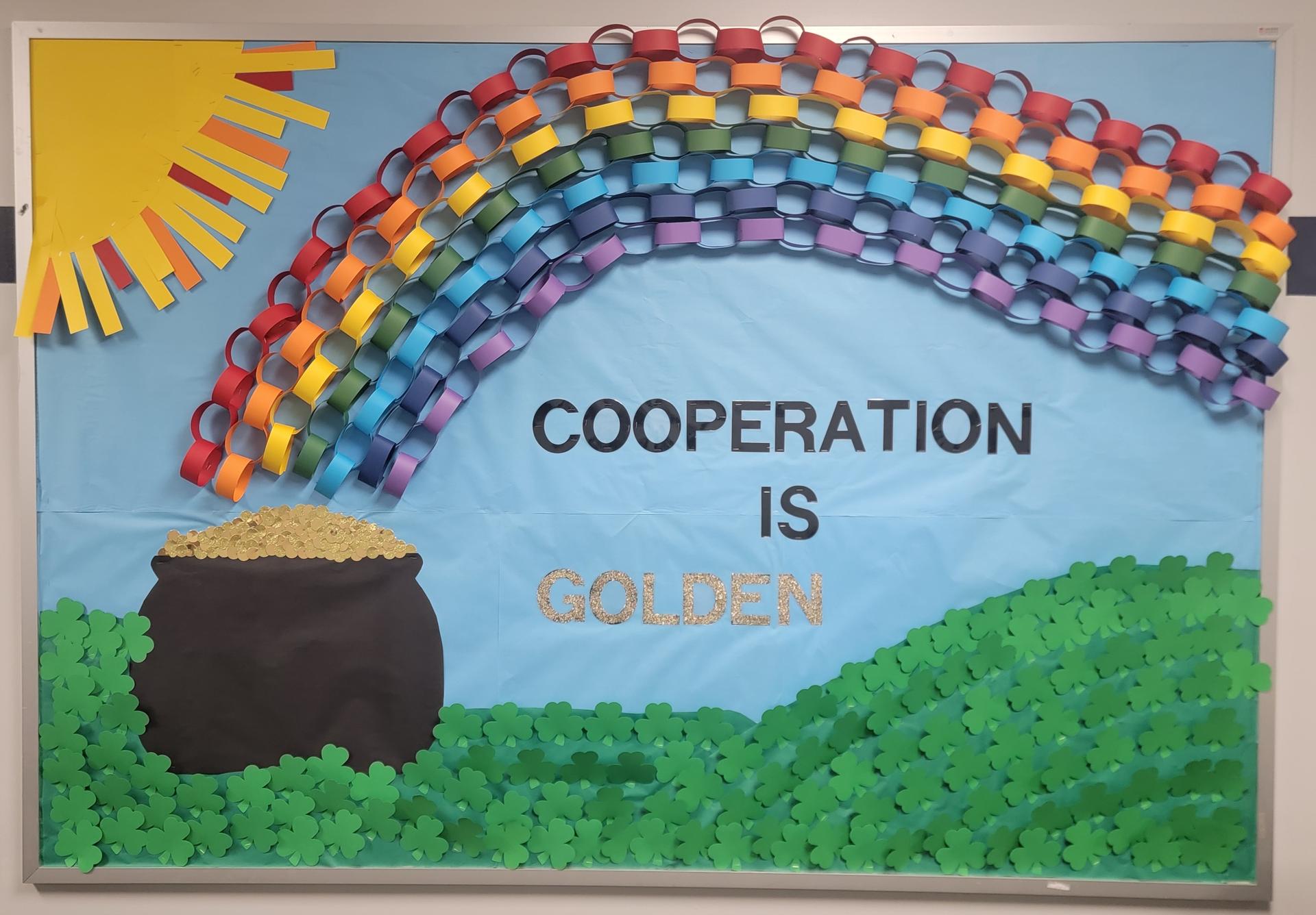 Our March bulletin board is shining bright with a very important reminder: Cooperation is Golden!