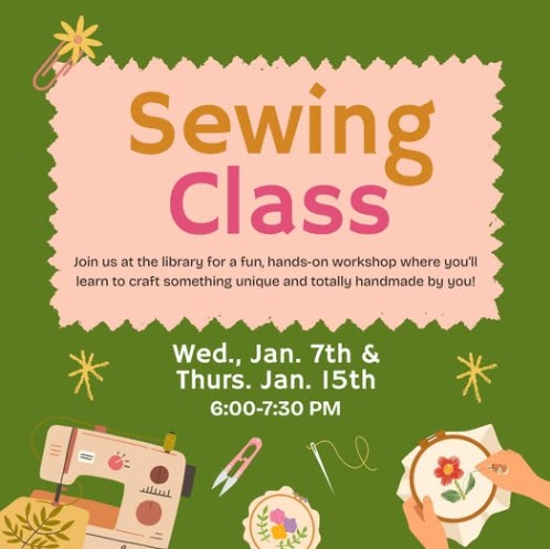 Two more opportunities to participate in the library's Sewing Class are coming up this week and next week! This Wednesday, January 7th and next Thursday, January 15th at 6:00-7:30pm.