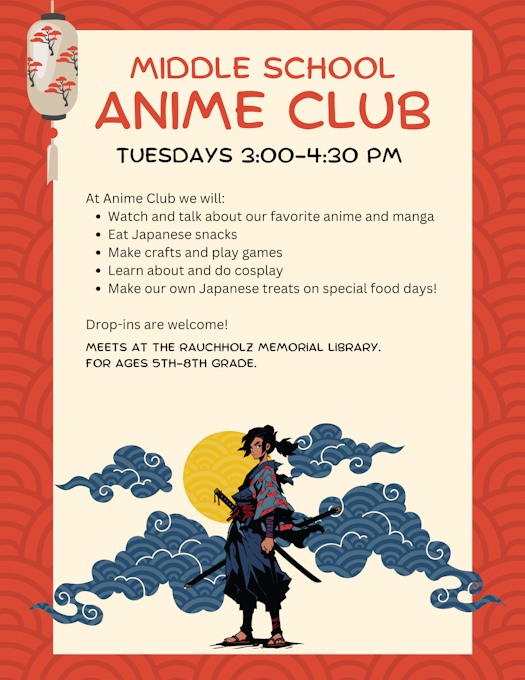 Middle School Anime Club meets on Tuesdays at 3:00 pm - 4:30 pm |