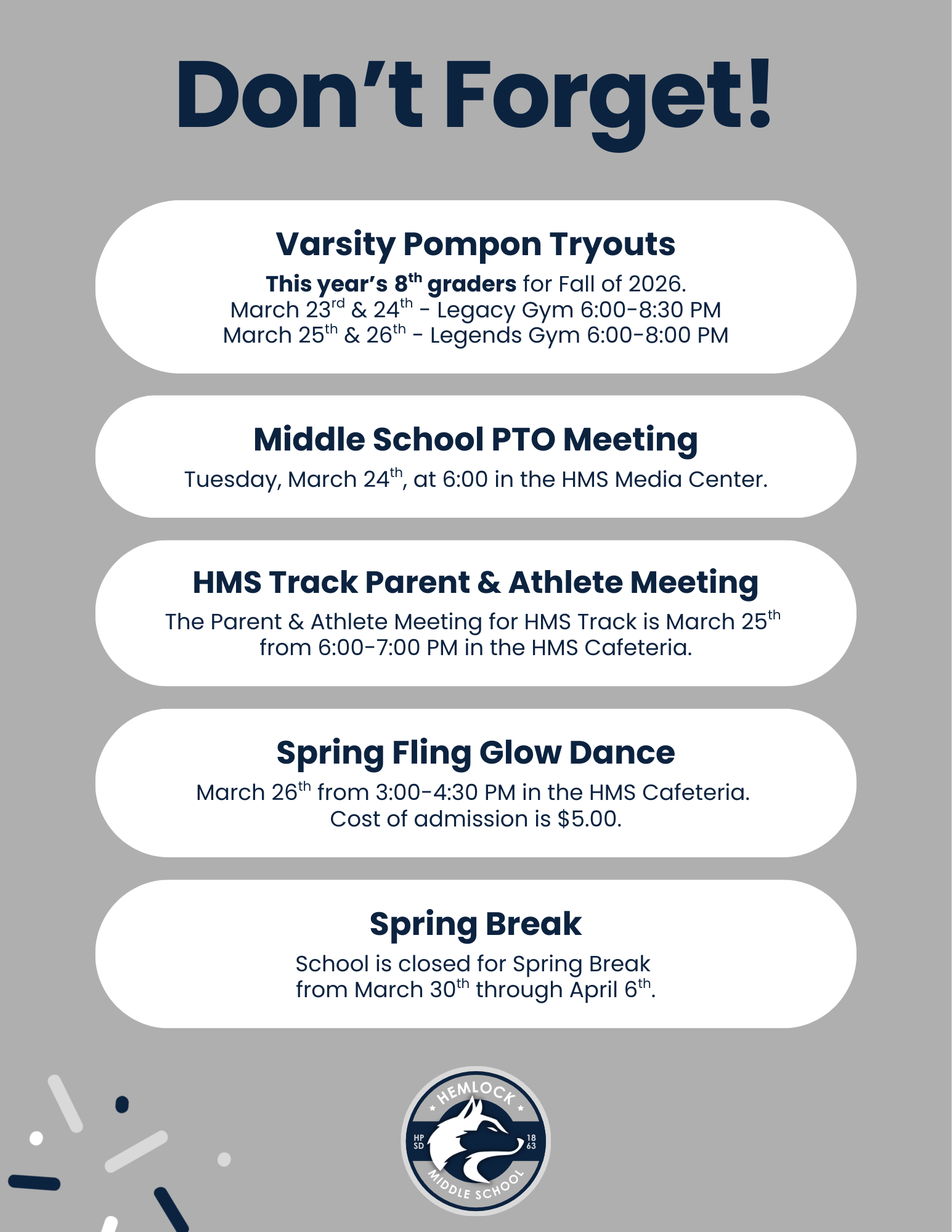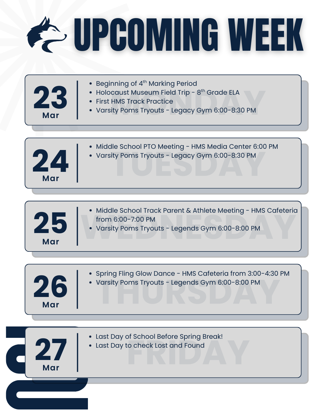 Attention, HMS Families - the Weight Room is to be used for lifting only. If a student is not lifting, they are not able to be in the Weight Room. When lifting is finished, students must leave the building. Thank you! |